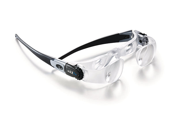 The MaxTV® glasses are hands-free, head-mounted glasses that provide 2.1x magnification AND can be adjusted so that each eye lens can be focused separately [±3 diopters], making the system adaptable to most patients.
